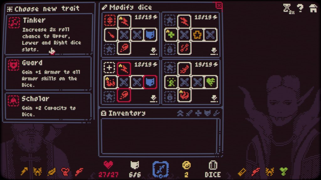 Las reliquias ofrecen modificaciones pasivas y profundas. Pueden cambiar tipos de daño, añadir efectos como veneno o devastar enemigos desde el principio. Combinadas con caras específicas de dados, pueden generar builds extremadamente potentes y distintos en cada run. Parte de la magia del juego es descubrir qué reliquia transforma radicalmente tu estilo, y cómo reorganizar tus dados al vuelo para aprovecharla al máximo.