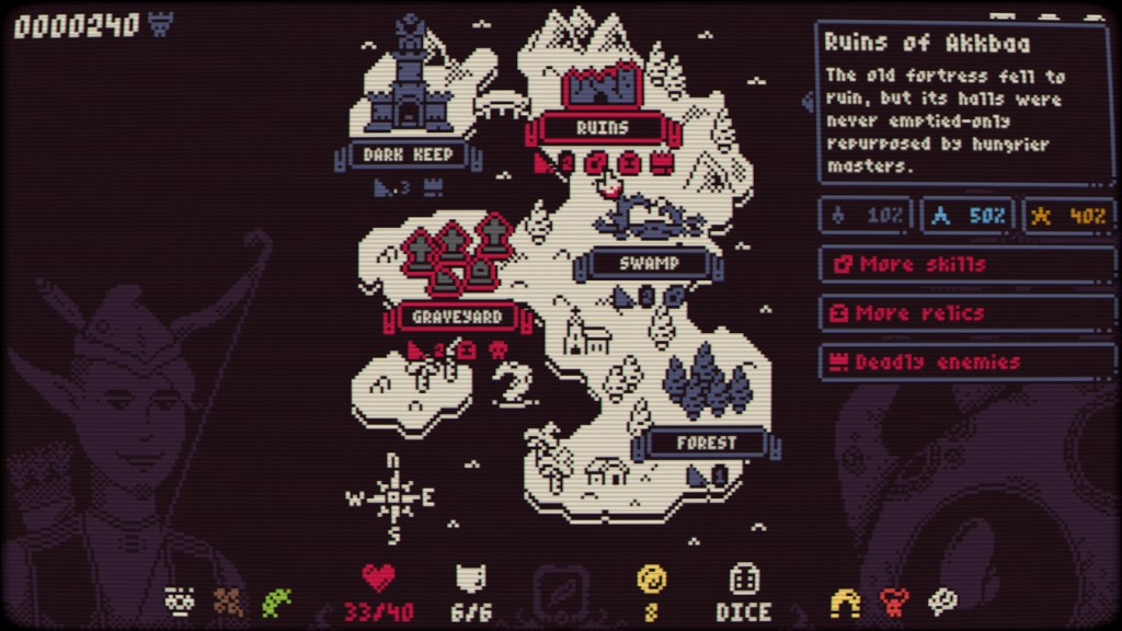 La interfaz de usuario también sigue ese enfoque pragmático. Los menús son nítidos, los textos legibles, la información de dados y relics accesible sin sobrecargar la pantalla. Esa claridad es fundamental en un juego donde cada elemento de la interfaz representa decisiones tácticas. En conjunto, los gráficos no buscan impresionar, sino sostener la sensación de un mundo cruel, íntimo y mortal.