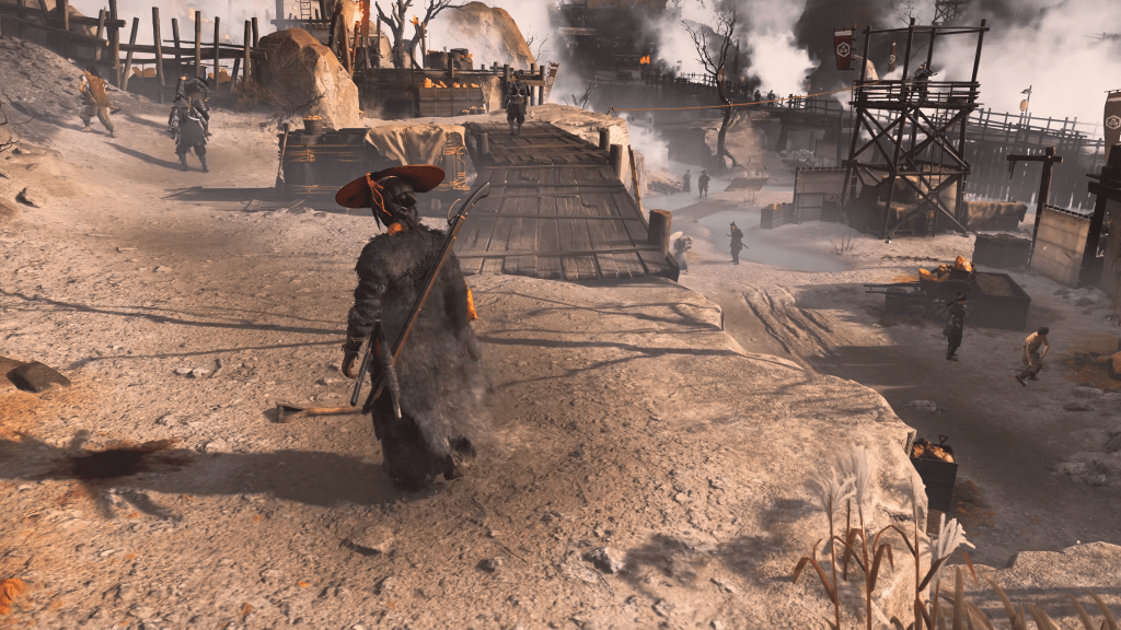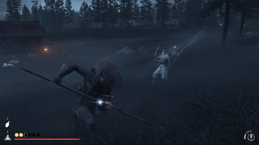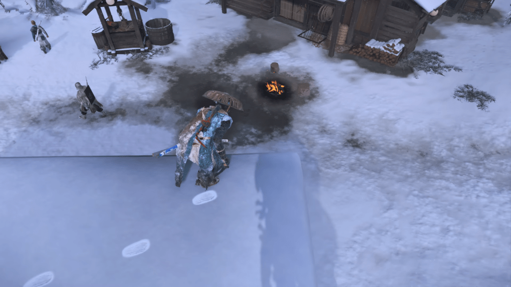 El sigilo ha sido objeto de una profunda revisión. Atsu es una depredadora, y su enfoque es más agresivo que el de Jin. El «oído enfocado» regresa, pero las herramientas son más letales y tácticas. Dispone de un arsenal de trampas, como lazos que cuelgan a los enemigos de los árboles o trampas de espinas cubiertas por la nieve. El kaginawa no solo sirve para la travesía, sino que puede usarse para realizar eliminaciones sigilosas desde cornisas o incluso para tirar elementos del escenario sobre los guardias. La gran novedad es la inclusión de un compañero lobo, «Kamu». Lejos de ser un botón de «ataque» omnipotente, el lobo es una herramienta de sigilo táctico. El jugador puede ordenarle explorar un área para marcar enemigos, crear una distracción vital aullando en la distancia, o, una vez mejorado, realizar eliminaciones sigilosas en tándem con Atsu o arrastrar cuerpos fuera de la vista. Su uso está limitado por un medidor de confianza que se recarga lentamente, obligando al jugador a usarlo estratégicamente. La inteligencia artificial enemiga ha mejorado en consecuencia; los guardias son más perceptivos a los sonidos, notan las huellas en la nieve, buscan en grupos coordinados y son mucho más conscientes de las amenazas verticales.