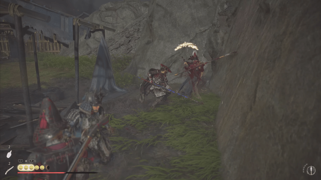 El arsenal es el corazón de la jugabilidad. La katana individual es el arma por defecto: equilibrada, rápida y el pilar del sistema de parry y esquiva. Es la herramienta multiuso. Las katanas dobles son la opción de la agresión pura; ofrecen ráfagas de golpes increíblemente rápidas que destruyen a enemigos sin armadura y generan «Resolución» a gran velocidad, pero carecen de poder de parada y su capacidad defensiva es limitada. La yari (lanza) es el arma de control de masas; sus ataques de barrido y estocadas de medio alcance son perfectos para mantener a raya a grupos de enemigos y castigar a la caballería. La ōdachi (gran espada) es la solución a la armadura pesada; es lenta, deliberada y cada golpe es devastador, capaz de romper guardias y escudos con una fuerza imparable. Finalmente, el kusarigama (cadena y hoz) es el arma más técnica y espectacular, diseñada para el combate a media distancia, permitiendo a Atsu desequilibrar, tropezar y atraer a los enemigos hacia ella para combos acrobáticos.