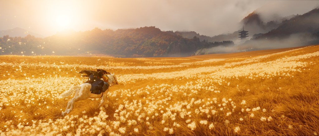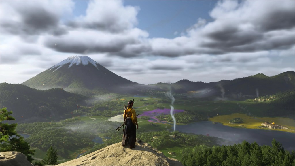 Si Ghost of Tsushima fue el canto de cisne de la PlayStation 4, Ghost of Yōtei es la demostración de poderío de la PlayStation 5. Al ser un título desarrollado exclusivamente para la nueva generación, Sucker Punch se ha liberado de cualquier lastre técnico para crear uno de los mundos abiertos más impresionantes y cohesivos jamás realizados. El salto visual no es meramente incremental; es transformador. La dirección artística sigue siendo el sello distintivo del estudio, pero la ejecución técnica es la que permite que esa visión cobre vida con una fidelidad asombrosa. La escala del mundo es sobrecogedora. Las distancias de dibujado son prácticamente infinitas, permitiendo al jugador ascender al pico de una montaña y observar la totalidad de la isla, con el humo emanando del cráter del Monte Yōtei como un recordatorio constante del poder de la naturaleza.