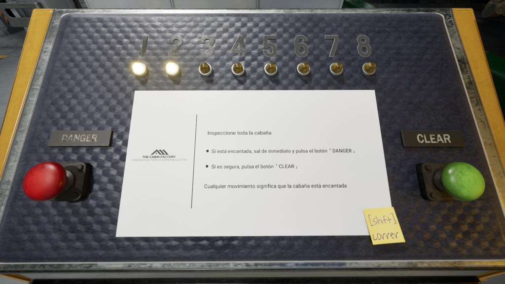 El apartado de jugabilidad es, con mucho, el núcleo más elaborado de este análisis y también el pilar sobre el que descansa gran parte del mérito del juego. En The Cabin Factory el jugador debe entrar a una cabaña prefabricada, caminar por sus habitaciones con la única herramienta de sus ojos, su intuición y su atención al detalle. La mecánica es en apariencia simple: examinar cada rincón, observar objetos, escuchar sonidos, percibir anomalías y al final pulsar uno de dos botones: “CLEAR” si considera que el espacio es seguro, o “DANGER” si detecta que está poseído. Esa sencillez mecánica es engañosa, pues la tensión del juego se construye precisamente al obligar al jugador a decidir con mínimas herramientas, en un entorno que se resiste a la claridad. El juego exige que uno desconfié, que observe los detalles (una taza que se mueve, una figura que aparece donde no debería, un paso que no encaja) y que timing y certeza confluyan en una decisión que puede tener consecuencias.